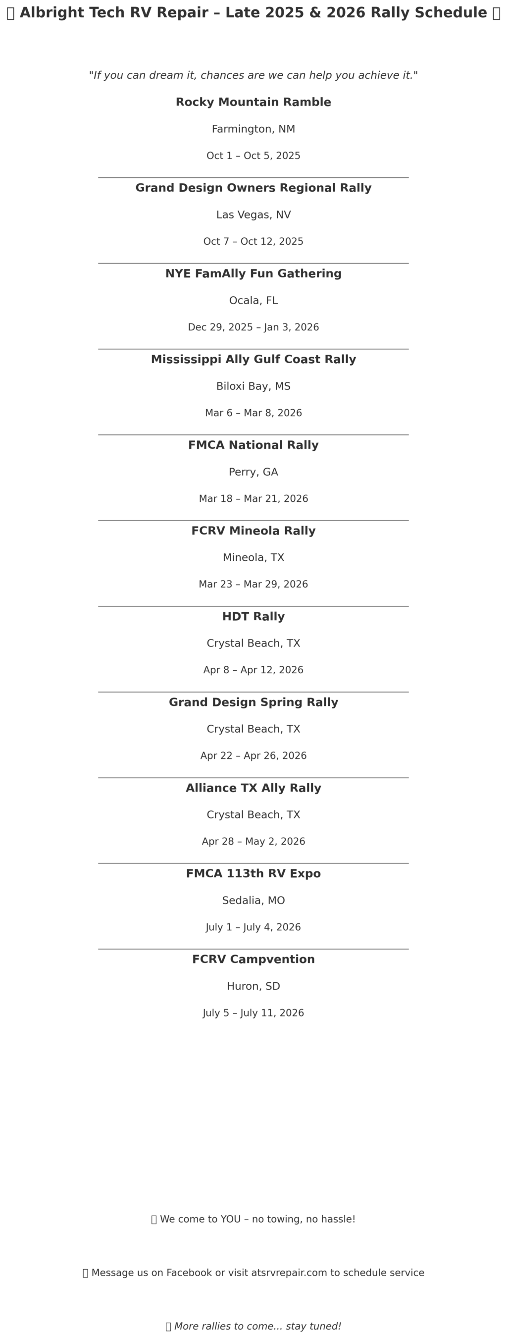 Summer 2025 is shaping up to be one for the books, and Albright Tech RV Repair is hitting the road to keep your rigs rolling and your campfires crackling. We’ll be traveling across multiple states this season, bringing expert mobile RV repair right to your site — because breakdowns shouldn’t break the adventure. You’ll find us at several FCRV rallies this year, proudly including Campvention 2025, where we’ll be wrenching, patching, and solving the mysteries behind those weird clunks and flickering lights. Whether you're parked lakeside or rally-bound, we’re here to make sure your RV is running smooth so you can focus on making memories. Because when your home has wheels, your peace of mind should too.